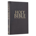 The front cover and spine of the solid black hardcover of the Pew Bible both display a gold foiled title and version reference.