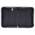 Coordinating gold hardware attaches the faux leather lay-flat handle to the spine. A zipper with a smooth gliding zipper pull, also in gold,  is engraved with a cross. A slip pocket on the back panel is a useful feature to keep notes and small notebooks. Inside the Bible cover are two pen loops that allow you to conveniently carry both a pen and a highlighter.