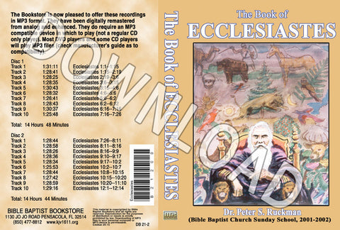 Downloadable MP3 of the book of Ecclesiastes. Verse-by-verse Bible Baptist Church Sunday School lessons recorded in 2001 - 2002. Two zipped folders containing 29 hours, 32 minutes. By Dr. Peter S. Ruckman.
