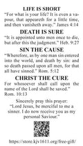 These gospel tracts are full color cardstock and the same size as business cards that fit your wallet or purse well. - 2" x 3.5"