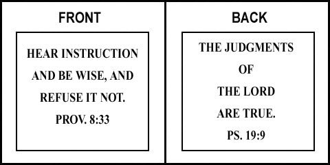 Front: HEAR INSTRUCTION, AND BE WISE, AND REFUSE IT NOT. PROV. 8:33