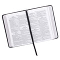 Sophisticated silver page gilt-edging compliments the silver foil of the title while an attached black satin ribbon page marker holds your place. A lay-flat flexcover allows the Bible to open flat without any damage to the spine. Inside the Classic King James Version Pocket Bible, you'll find reader-friendly subheadings, a double-column format, a thematic Scripture verse finder, the words of Christ in red, and a one-year Bible reading plan. The 6-type point print is on the smaller side to accommodate the compact size. The Bible comes packaged in a full-color printed cardboard sleeve.