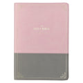 The smooth front and back covers of the Bible are separated in a color block design with a light pink band that covers the top two-thirds of the cover and a light gray band that covers the bottom third. A double row of topstitching joins the color blocks together. A delicate gold foiled frame with corner scroll designs runs along the borders of the book.